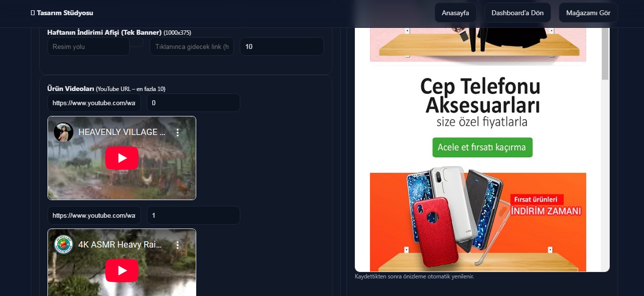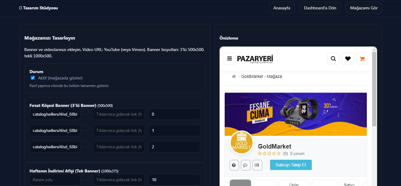 - Satıcı mağazasını tasarlayabilir ( Banner , video ve eklediği bannerlara link) verebilir şekilde ayarlayabilir.