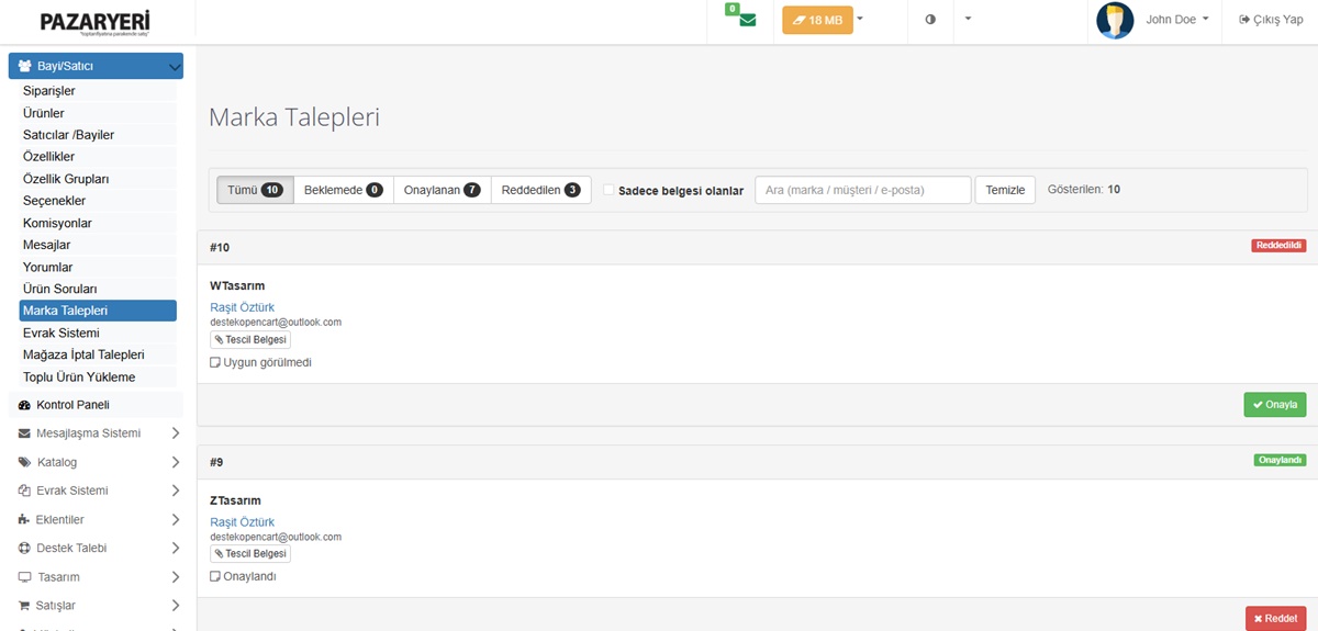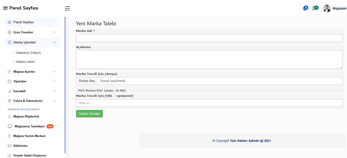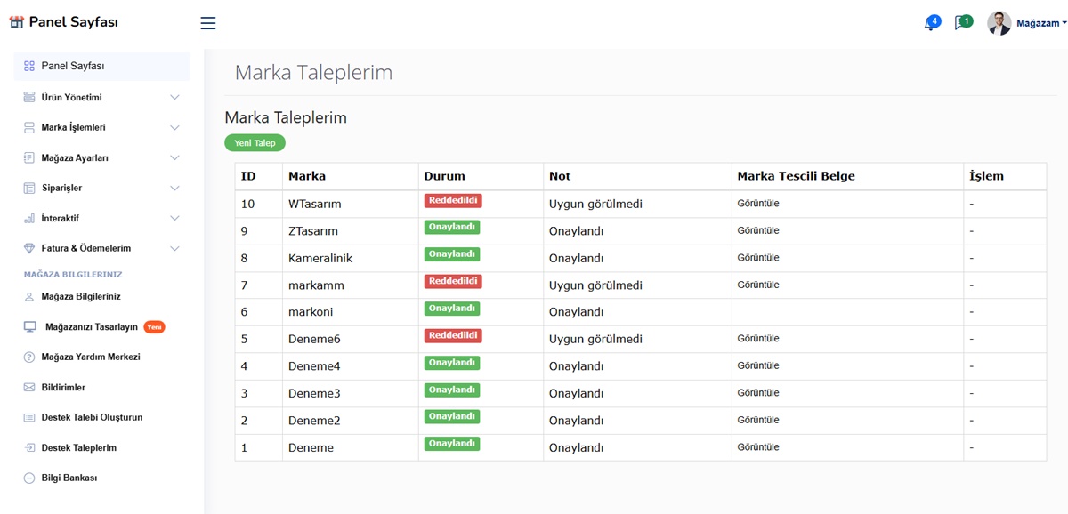 - Marka Talep Sistemi (Satıcı kendi markasını ekleyebilir gerekli belgeleri gönderdikten sonra)