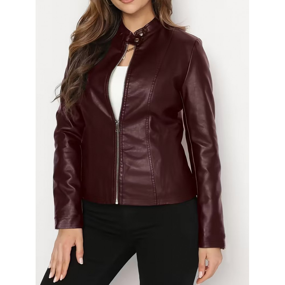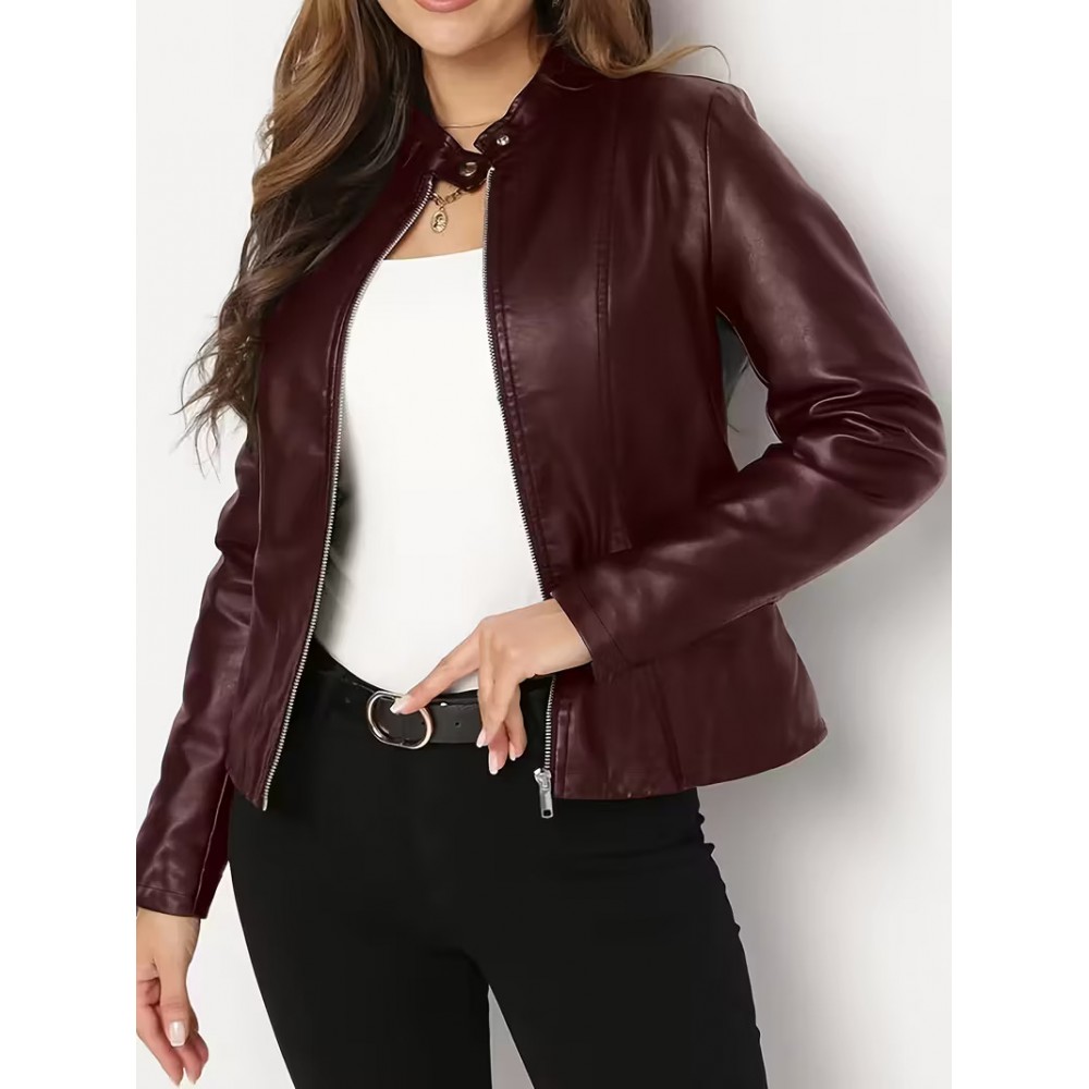 Deri Ceket - Kırmızı Tam Fermuarlı Uzun Kollu Motosiklet Montu 251014115455