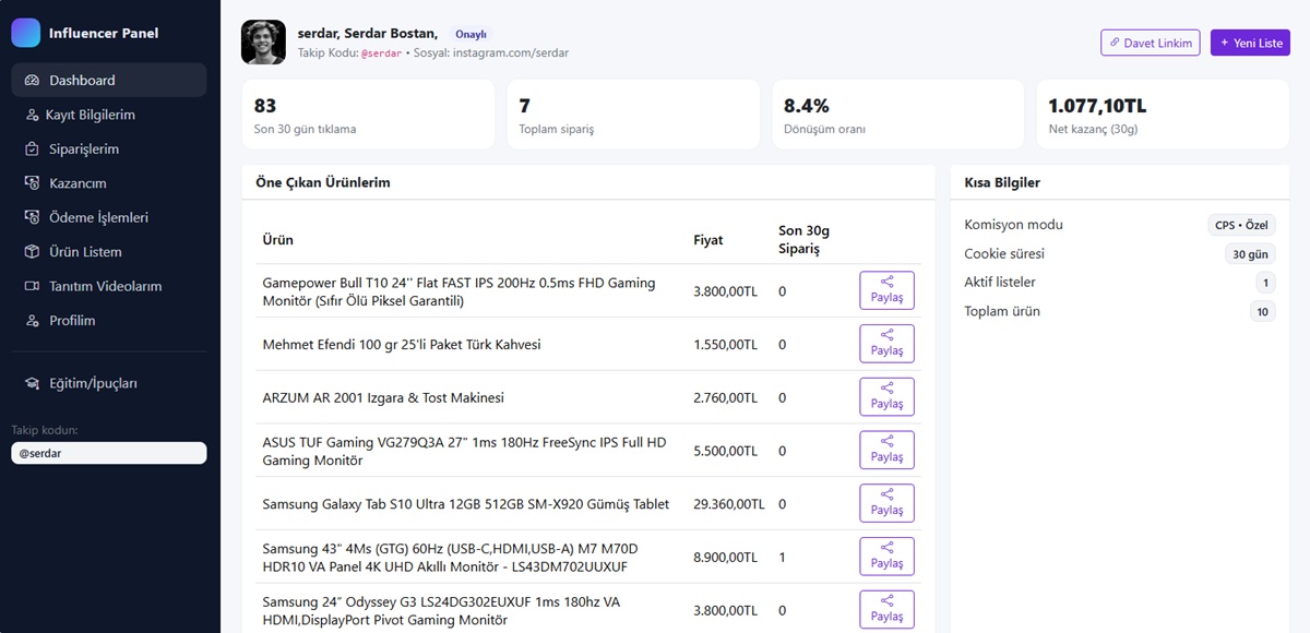 - Esnek komisyon ayarlayabilirsiniz , her satış ortağı & infulancer için ayrı komisyon oranı verebilirsiniz