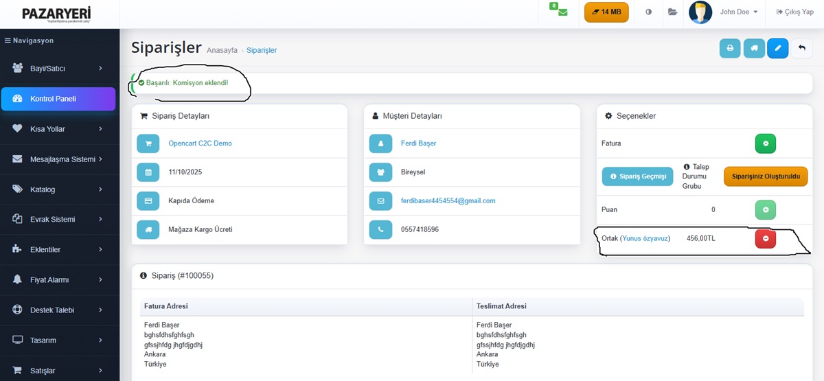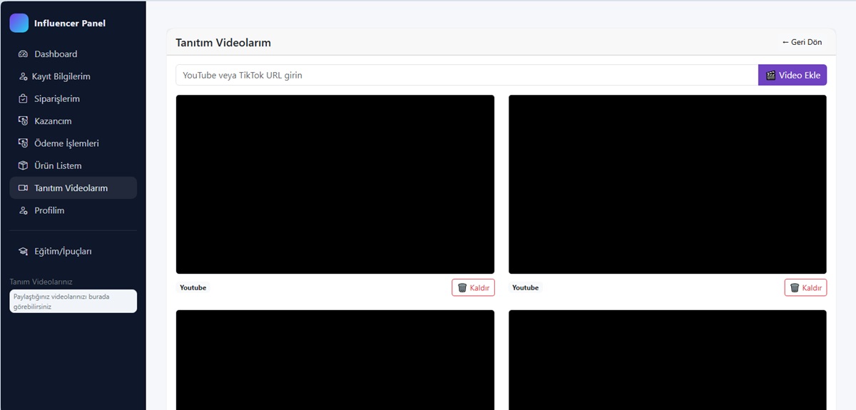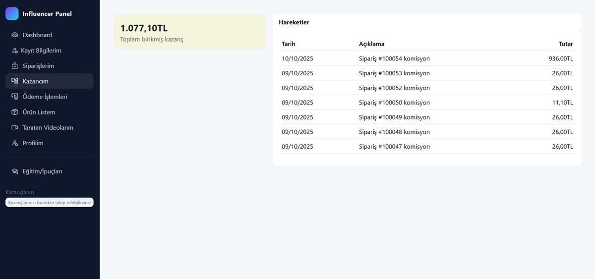 - Kod/bağlantı üzerinden gelen onaylı siparişler komisyona dahildir. Yani Admin panelde yönetici komisyon ekle yaptığı anda kazanç olarak işlenir.