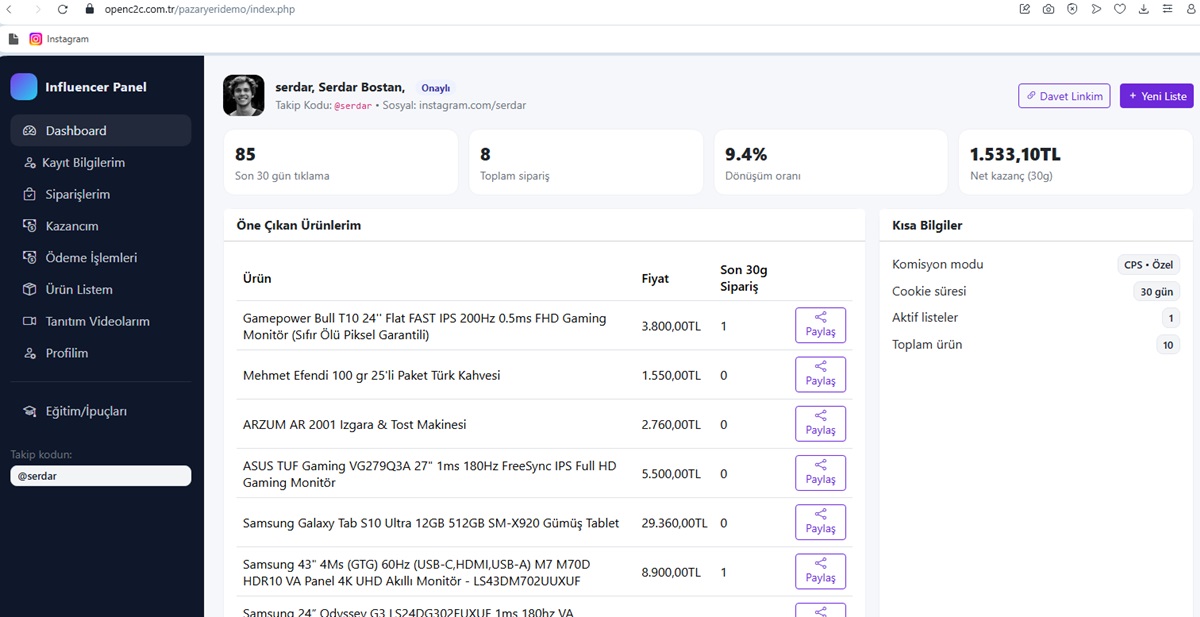Opencart alt yapılı sisteminiz için satış ortaklığı için ortaklık sistemini geliştirdik infulancer modülü haline getirdik.Opencart altyapısında bir ilki gerçekleştirdik Opencart infulancer modülünü kullanıma hazırladık.