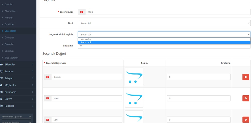 Seçenekler kısmından renkleri eklersiniz (resimleri ile beraber) sonrasında seçenek kısmından resim ve buton stili seçmelisiniz