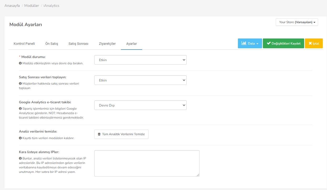 - Ana OpenCart kontrol panelinde iAnalytics istatistiklerini etkinleştirme/devre dışı bırakma seçeneği