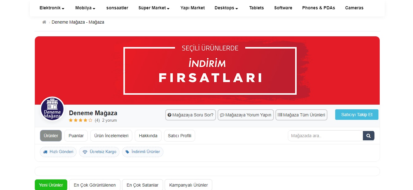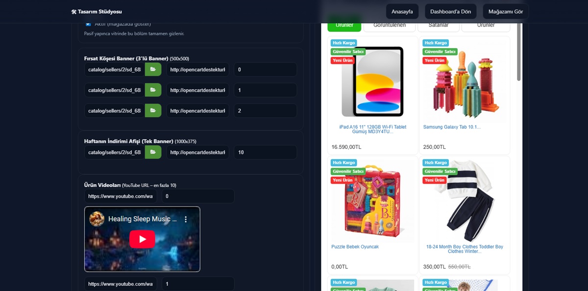 - Satıcı mağazasını tasarlayabilir ( Banner , video ve eklediği bannerlara link) verebilir şekilde ayarlayabilir.