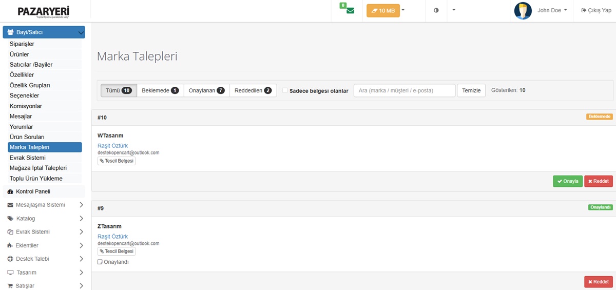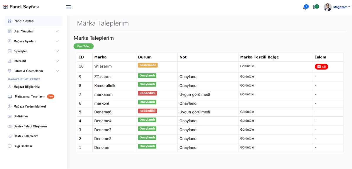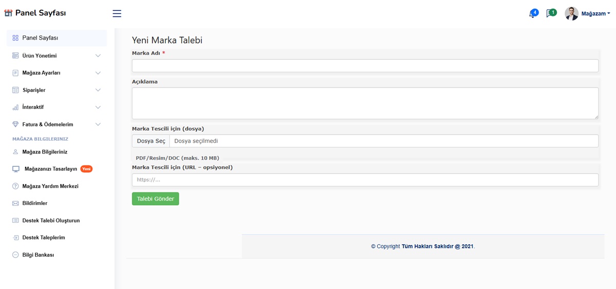 - Marka Talep Sistemi (Satıcı kendi markasını ekleyebilir gerekli belgeleri gönderdikten sonra)