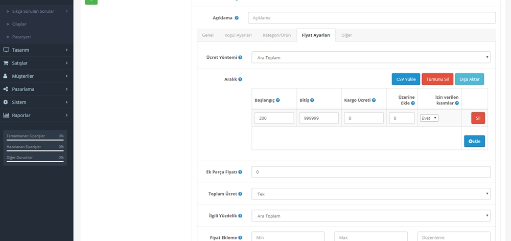 Gelişmiş bir Kargo modülüdür. Kendi gönderim yönteminizi ve fiyatınızı tanımlamak istiyorsanız, bu modül mükemmel bir çözümdür. Bu modülde kendi gönderim yönteminizi oluşturabilir ve yöntem adını istediğiniz şekilde verebilirsiniz. Gönderim yöntemini aşağıdaki ölçütlerle tanımlayabilirsiniz: