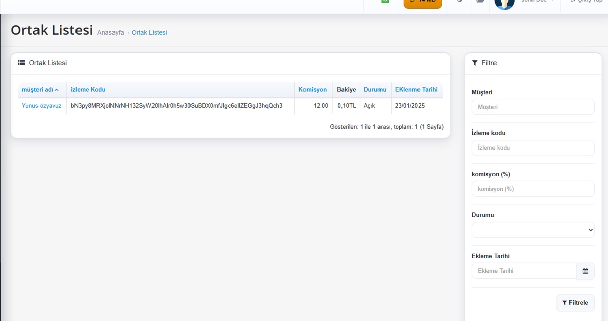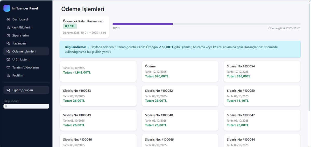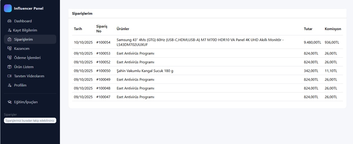 - Kod/bağlantı üzerinden gelen onaylı siparişler komisyona dahildir. Yani Admin panelde yönetici komisyon ekle yaptığı anda kazanç olarak işlenir.