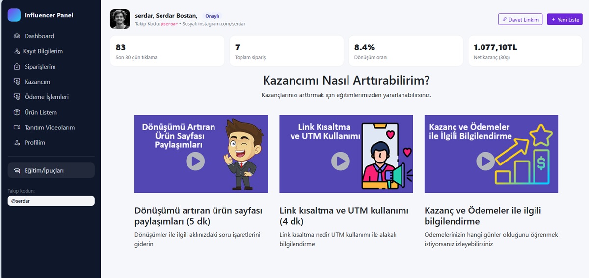 - Kayıt Ol – 1 dakikada başvur, kişisel link & kod oluştur.