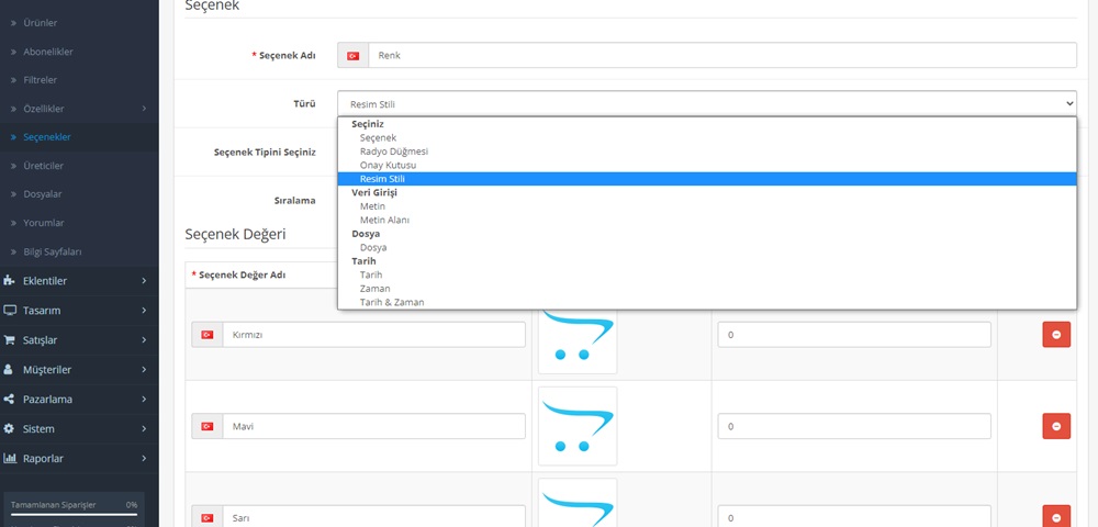 Seçenekler kısmından renkleri eklersiniz (resimleri ile beraber) sonrasında seçenek kısmından resim ve buton stili seçmelisiniz